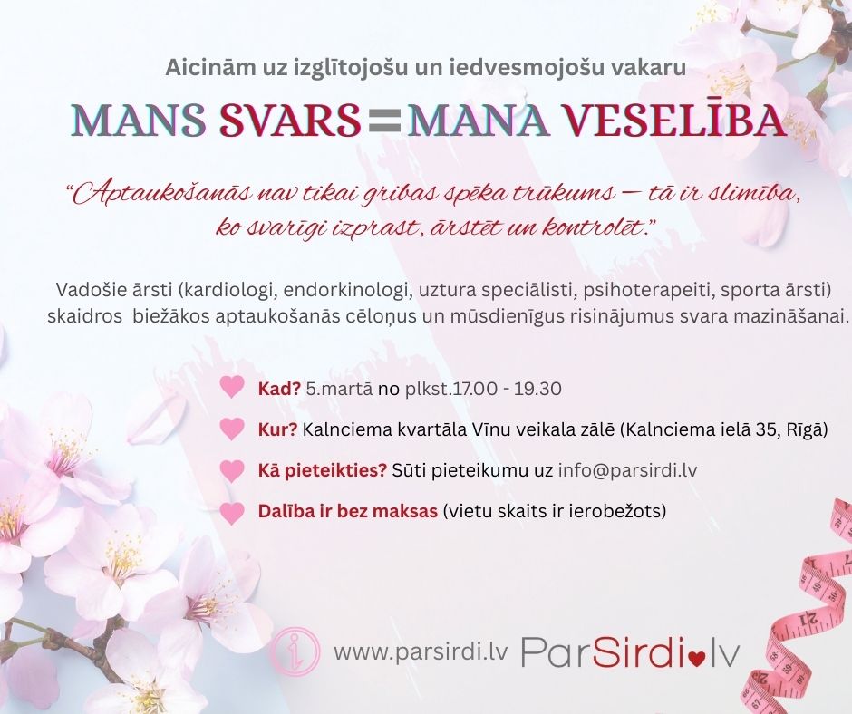 Lai palīdzētu un atbalstītu cilvēkus ar lieko svaru un aptaukošanos, biedrība ParSirdi.lv 5.martā plkst.17.00 Kalnciema ielas kvartāla Vīna zālē (Rīgā, Kalnciema ielā 35) organizē izglītojošu un iedvesmojošu pasākumu “Mans svars = Mana veselība”, kurā kopā ar kardiologiem, endokrinologiem, psihoterapeitiem, fizisko aktivitāšu un uztura speciālistiem tiks runāts par: