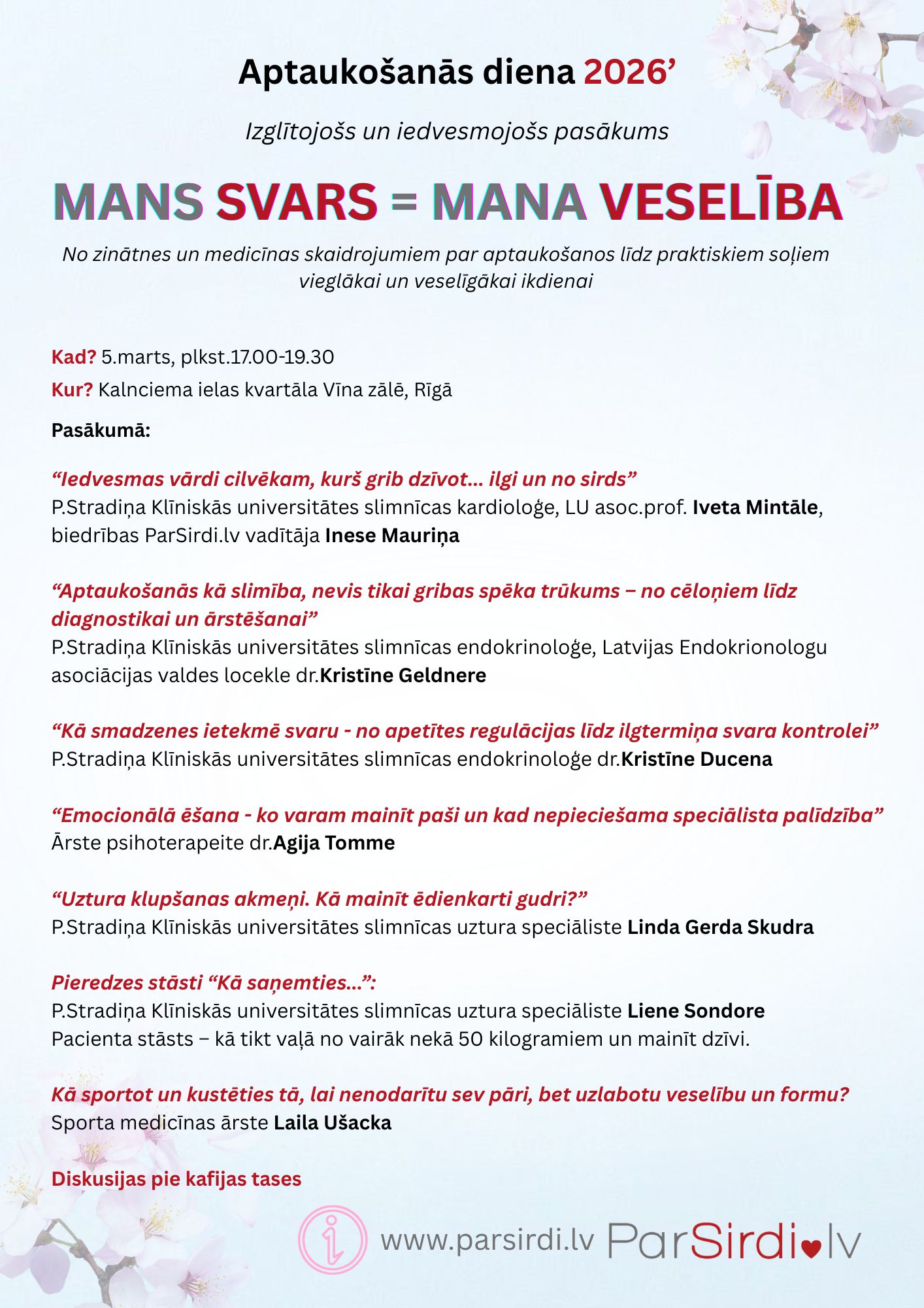 Lai palīdzētu un atbalstītu cilvēkus ar lieko svaru un aptaukošanos, biedrība ParSirdi.lv 5.martā plkst.17.00 Kalnciema ielas kvartāla Vīna zālē (Rīgā, Kalnciema ielā 35) organizē izglītojošu un iedvesmojošu pasākumu “Mans svars = Mana veselība”, kurā kopā ar kardiologiem, endokrinologiem, psihoterapeitiem, fizisko aktivitāšu un uztura speciālistiem tiks runāts par: